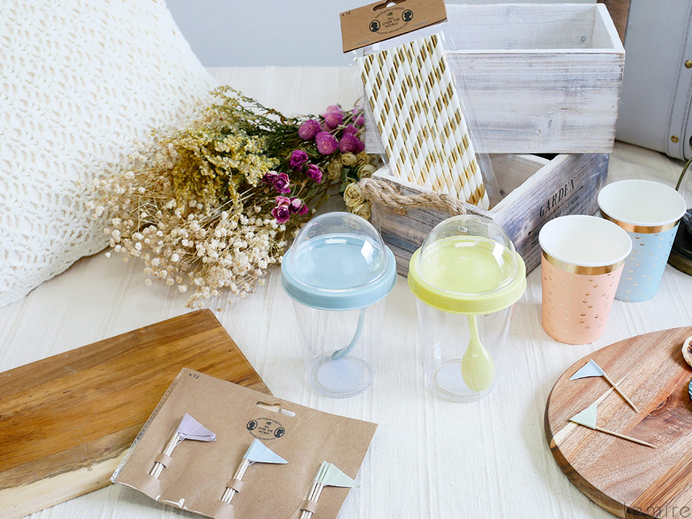 お弁当をデコレーションするフラッグもカラフルでGOOD。ストローも紙コップもパーティ仕様のゴールドが効いてます♪プラスチックのサラダボウルはミニスプーン付きです。
