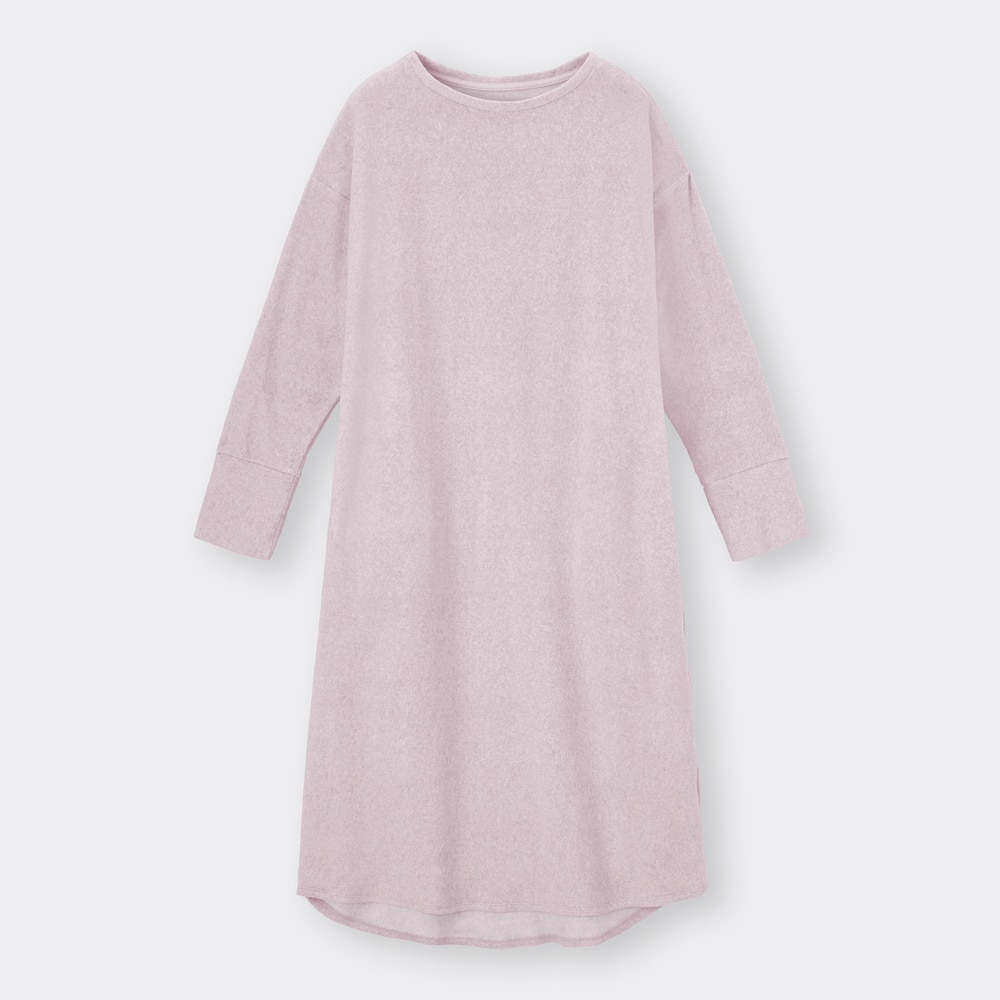まずご紹介するのは「スフレフィールラウンジワンピース」です。価格は税込み2,490円となっていますよ。軽くて暖かく、とってもよく伸びるストレッチフリース仕立てのワンピとなっています。肩回りは動きやすいドロップショルダー。裾のラウンドデザインが今っぽいアクセントになっていますよ。