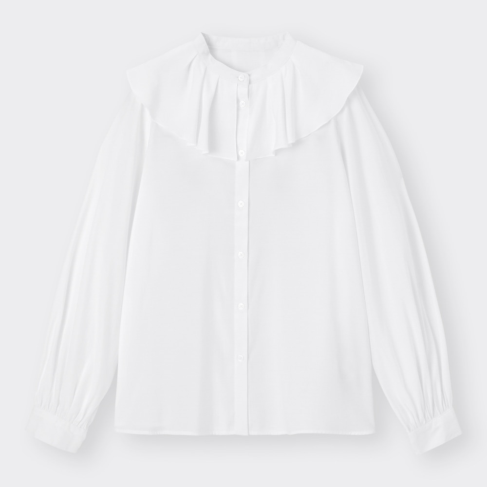 こちらは「ケープカラーシャツ」です。価格は税込み1,990円となっています。シンプルなデザインのシャツに、こなれたケープカラーがついたアイテム。そのまま着こなすのはもちろん、ニットやニットベストと合わせたレイヤードコーデにもおすすめです。レイヤードしてサロペットと合わせれば、甘辛Mixな着こなしが楽しめますよ。