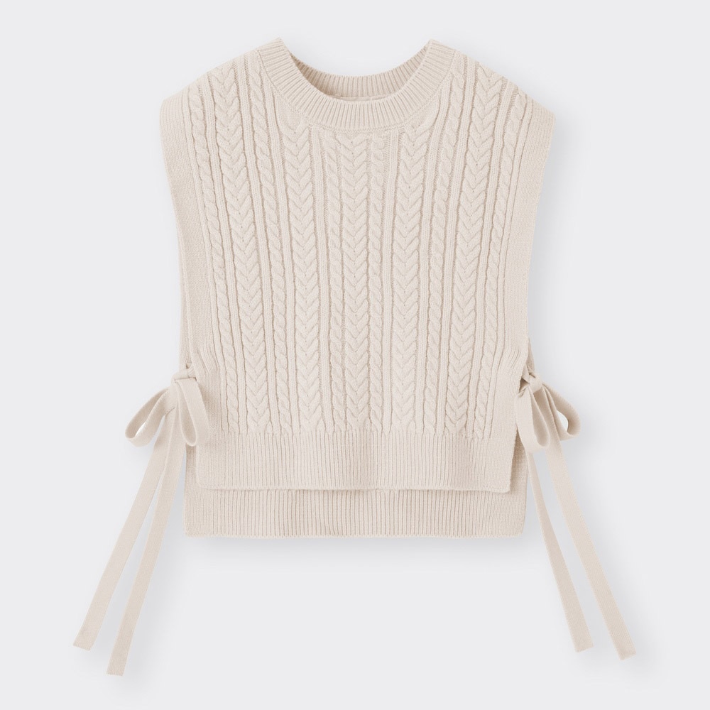 こちらは「ケーブルサイドリボンベスト」です。レイヤードコーデに大活躍してくれるアイテムですよ。サイドリボンのデザインがこなれ感を演出。前後差のあるヘムデザインになっているので、レイヤードコーデをより今っぽく仕上げてくれます。