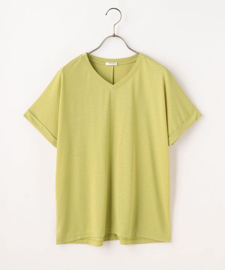 Vネックがスッキリとしたデコルテを演出し、大人カジュアルに役立つ折り返しデザインのTシャツ。