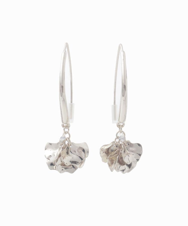 花びらのモチーフはメタリック素材で、ビジューを加えたピアスです。