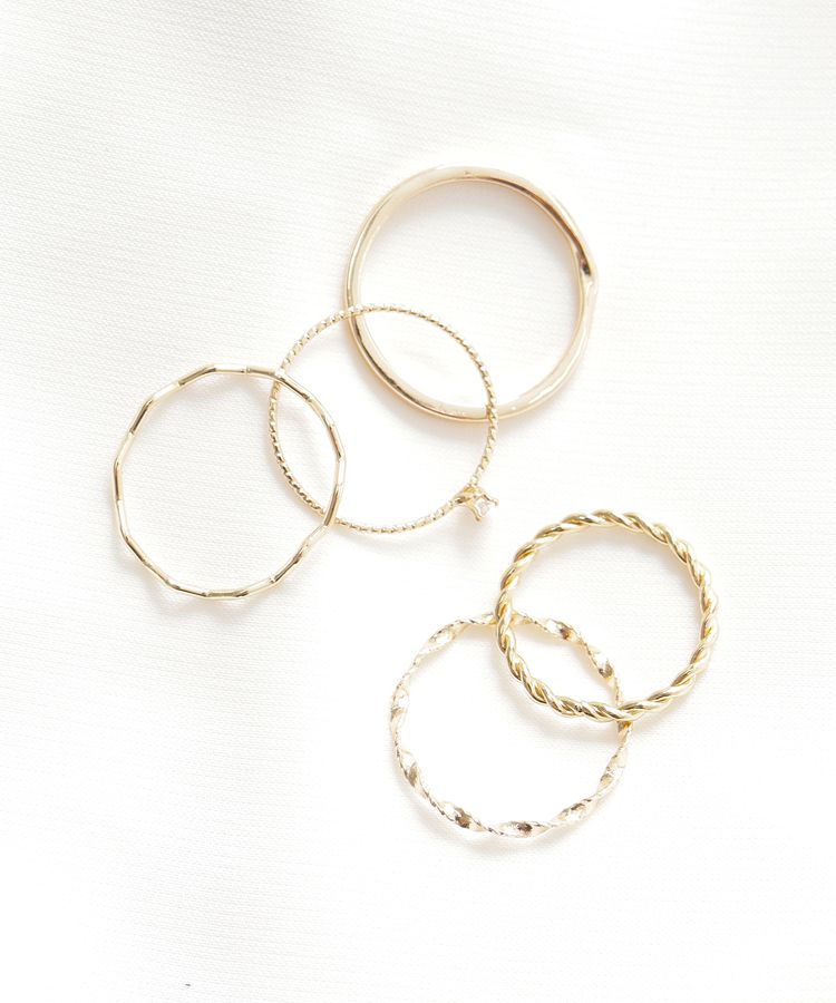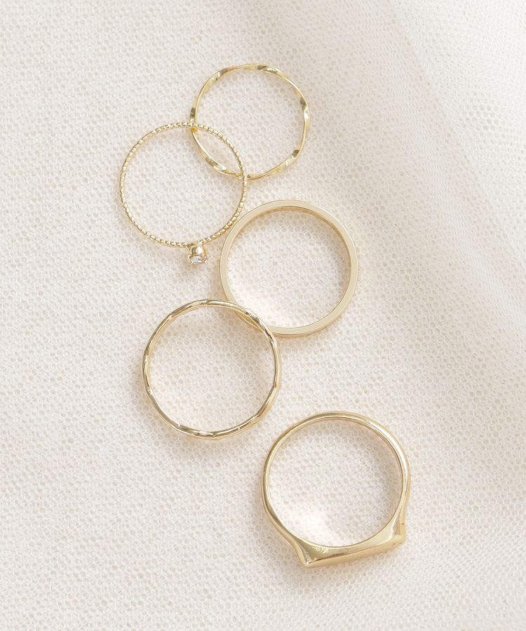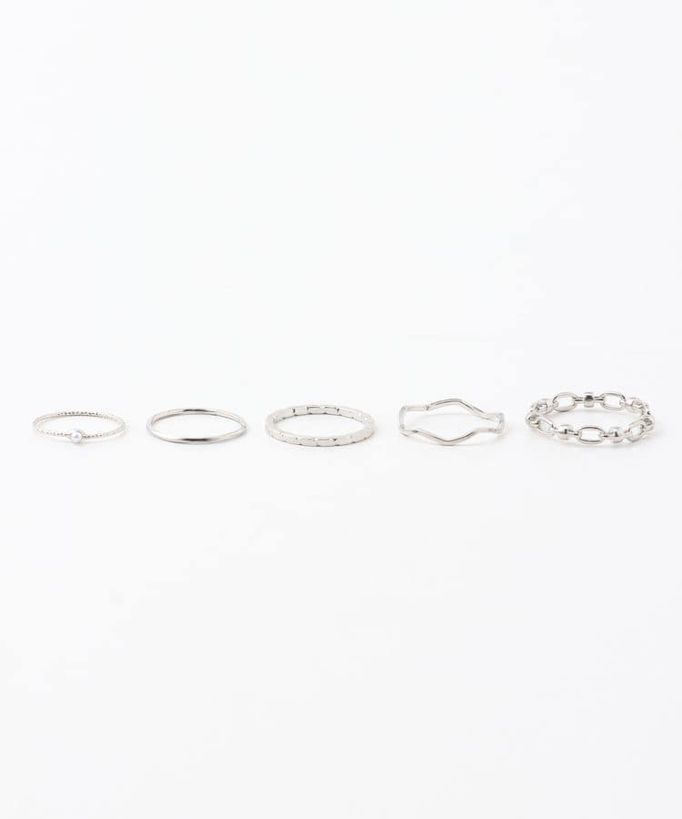 ビジュー付きのリングやチェーン風、ウェーブデザインなど5種類のアイテムのセット。