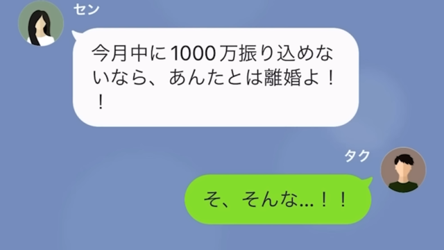 そしてセンは「今月中に1000万円を振り込まないと離婚する」とタクに言い渡します。