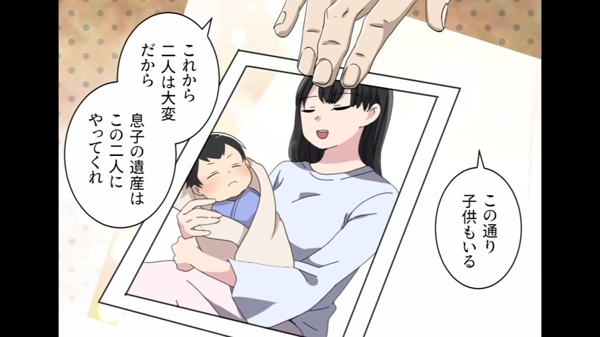 2人の間に子どもがいると言われ、証拠写真を見せる義両親。そして「遺産を浮気相手に渡してほしい」とお願いをされて…。