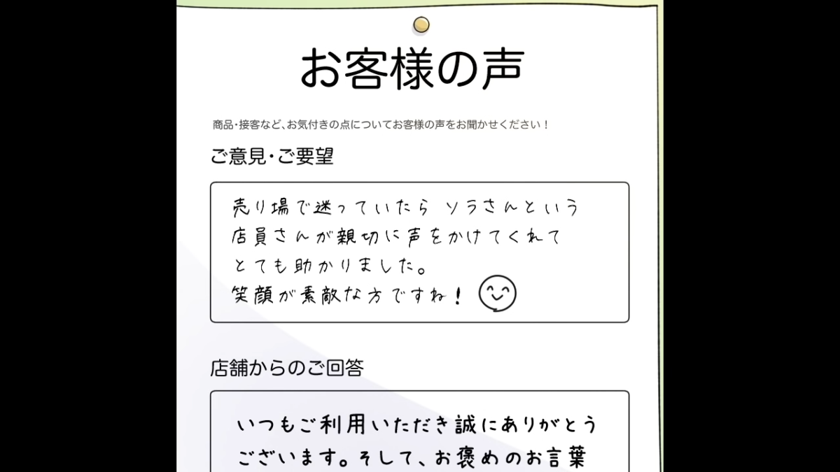 さらに、店内の掲示板に貼り出されたお客様の声には、主人公への嬉しい言葉が並びます。