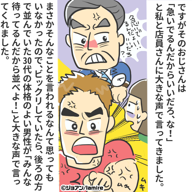 主人公や周りの客が呆然としていると、後ろにいた30代くらいの男性客が「みんな並んでるんだから並べよ!」と一喝。