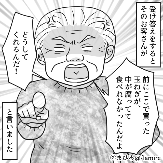 主人公が対応できかねますと謝罪していると、男性客の奥さんらしき女性が「最近玉ねぎを買ったのは別のスーパーでしょ!」と一喝。
