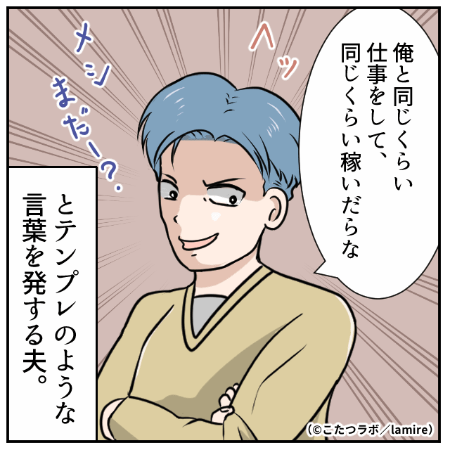 夫は主人公をねぎらうどころか「同じくらい稼いだらな」と言う始末で、育児をやる姿勢がまったくありません。