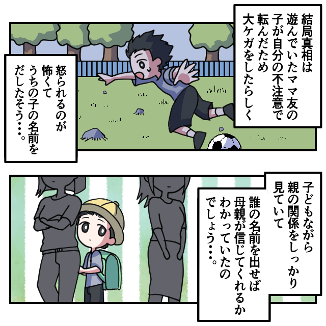 ママ友の子「突き飛ばされた」息子「やってない…」ママ友の子どもが”大ケガ”をしたのは息子のせい…!?⇒まさかの真相に絶句…